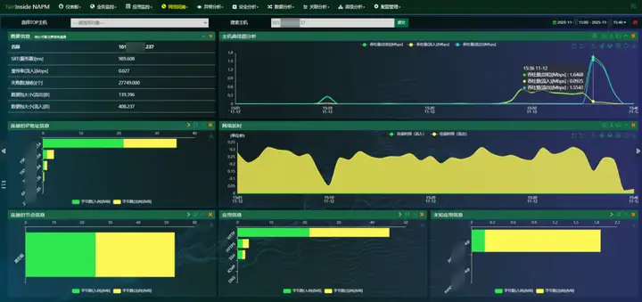 二、流量趋势分析: 锁定攻击核心特征 1、主机详细数据 基于NetInside网络流量分析系统的目标主机数据: ● 时间范围:2025年11月某时段 ● 流量基础特征:正常状态下吞吐量稳定在0.1Mbps以下,攻击时段吞吐量骤升至峰值1.6468Mbps(其中流入0.0925Mbps,流出1.5543Mbps),与攻击行为完全同步;攻击流量以TCP协议为主,HTTP和SSH流量占比超90%,为核心攻击载体。