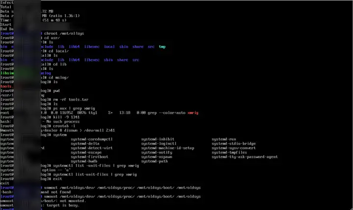 七、修复与加固措施 紧急修复措施 1、恶意清理:通过top命令定位恶意进程xmrig(PID:xxx),执行kill -9 xxx强制终止进程及关联子进程;删除/tmp、/var/tmp目录下的tools.tar压缩包、解压后的恶意程序及相关脚本,确保无残留。
