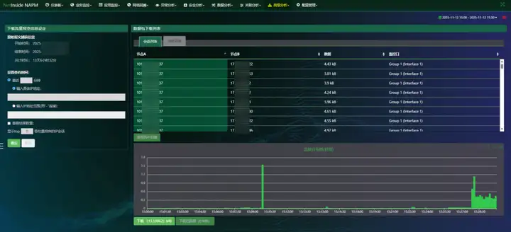 右键钻取与数据包下载:对目标主机数据执行“流量详细分析”操作,通过系统内置的数据包下载管理器,筛选对应时段流量会话下载数据包,为后续深度分析提供原始数据支撑。