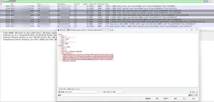 通过Follow → TCP Stream”功能追踪数据流,虽Payload为加密状态,但结合报文时序、数据长度及后续服务器行为,可判定为漏洞利用的核心攻击数据。