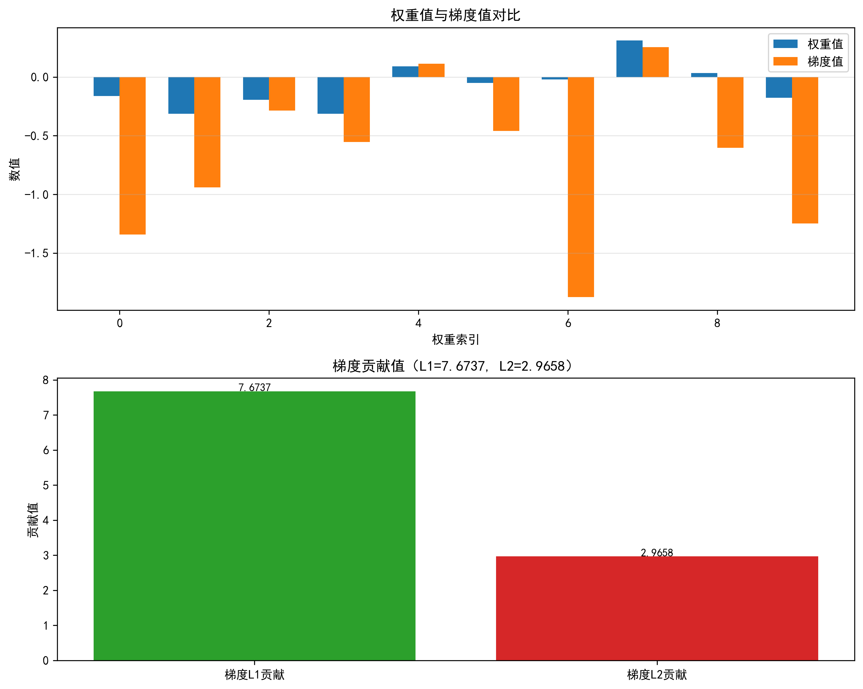 ax2.bar(['梯度L1贡献', '梯度L2贡献'], [grad_l1, grad_l2], color=['#2ca02c', '#d62728'])