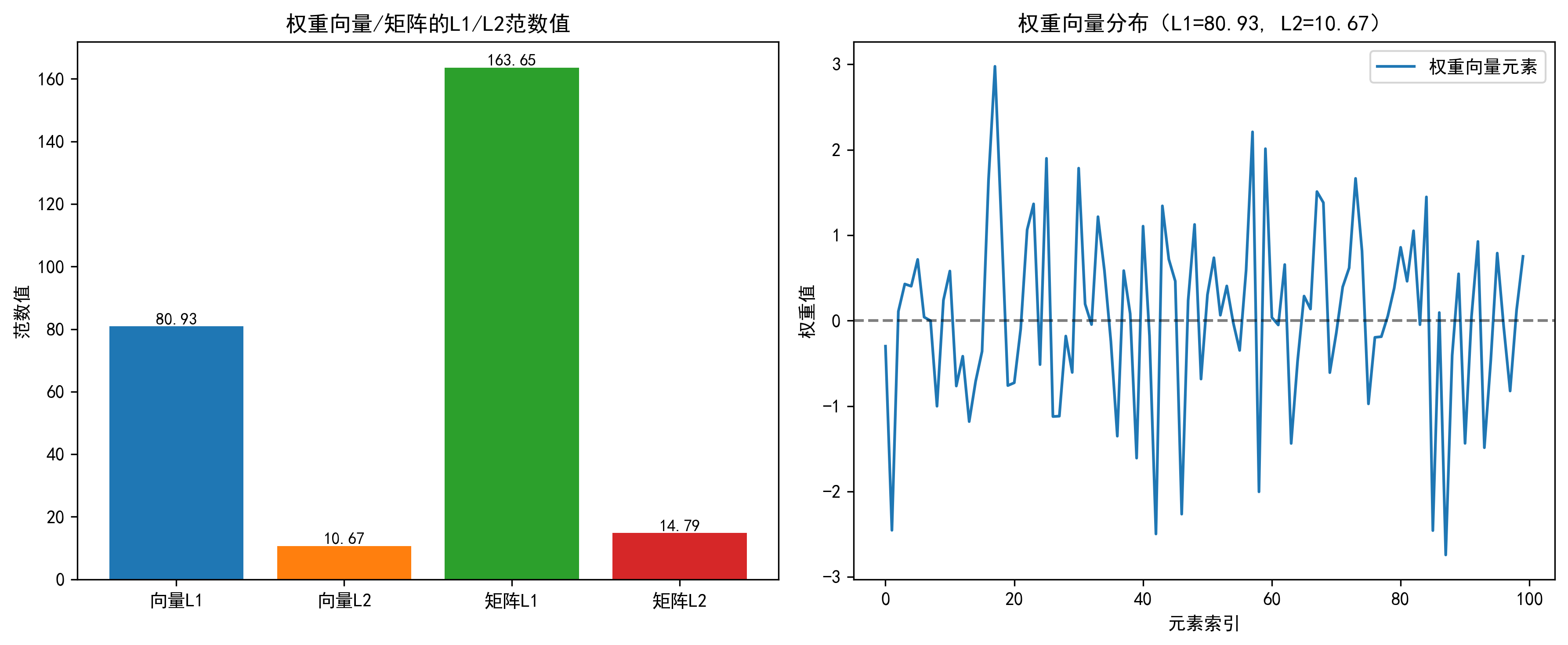 ===== L1/L2范数计算结果 ===== 权重向量L1范数(绝对值求和):80.93 权重向量L2范数(平方和开根号):10.67 权重矩阵L1范数(绝对值求和):163.65 权重矩阵L2范数(平方和开根号):14.79