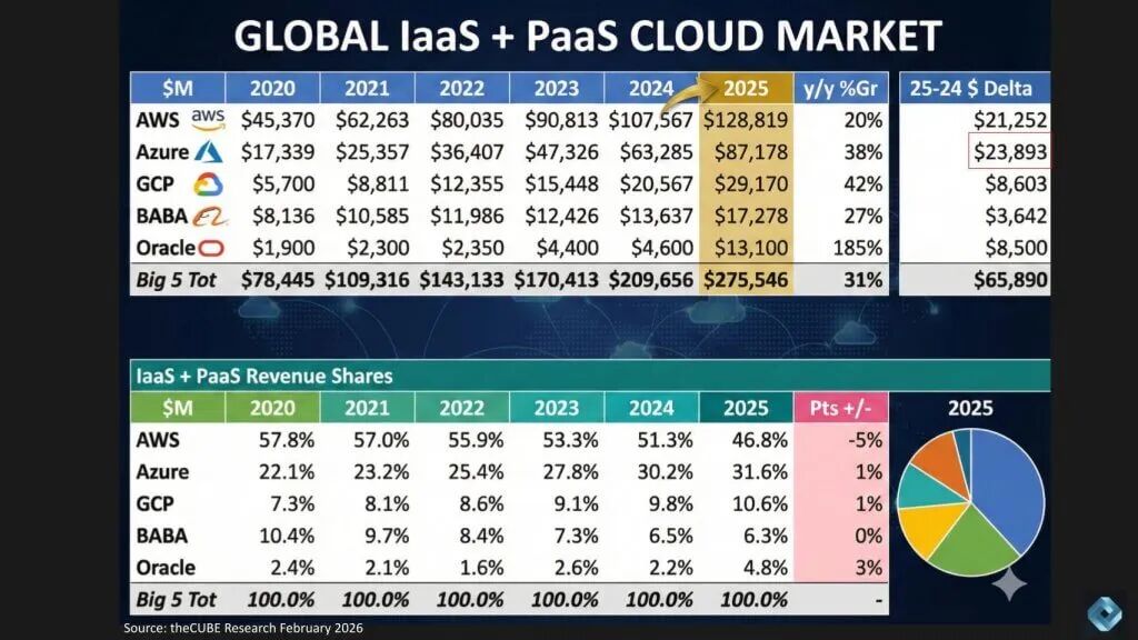 市场规模仍惊人。AWS 2025年IaaS和PaaS收入为1290亿美元,季度增长率24%。这保持AWS以宽裕优势最大。