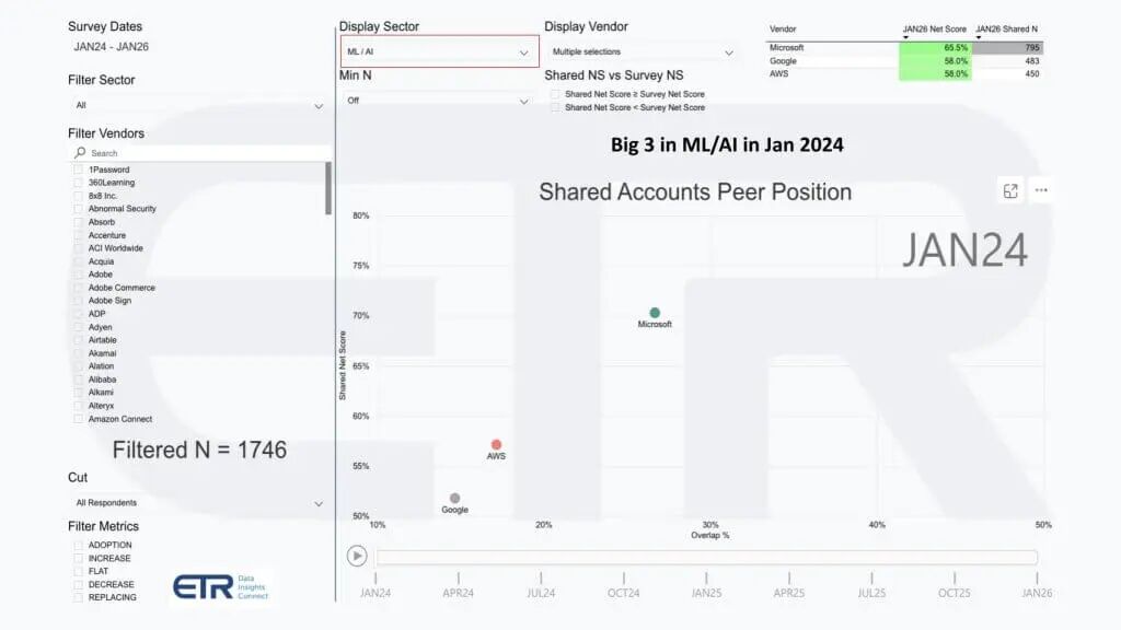 信息是Azure仍是ETR企业数据集中最主导云平台,AWS仍高度提升,GCP以现在账户级调查数据可见的速度获得渗透。谷歌在机器学习和AI的优势正拉动它前进,该AI主导势头作为更广泛云部门的显著顺风显现。