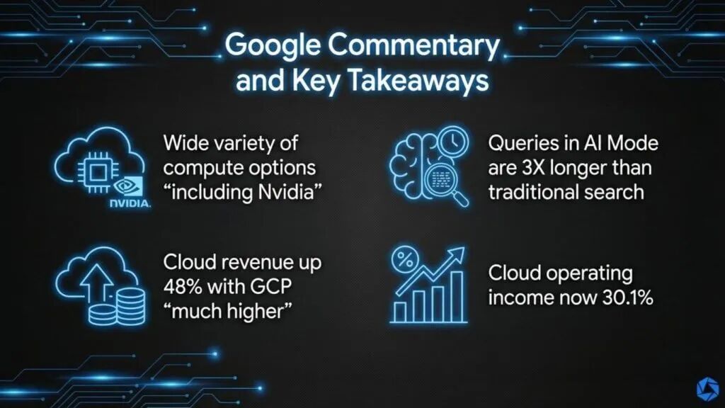 谷歌当前势头的最大具体证据在于云。谷歌报告[10]季度云收入增长48%,达177亿美元,云运营利润率升至30.1%,较去年17.5%大幅上升。管理层称该季度“出色”(我们完全同意),归因于企业AI产品强劲需求。他们还指出GCP非常强劲,GCP继续远超整体Google Cloud收入增长。谷歌不直接公布GCP收入,但含义是AI需求驱动基础设施需求并加速其云业务。而且,公司同时找到运营杠杆。