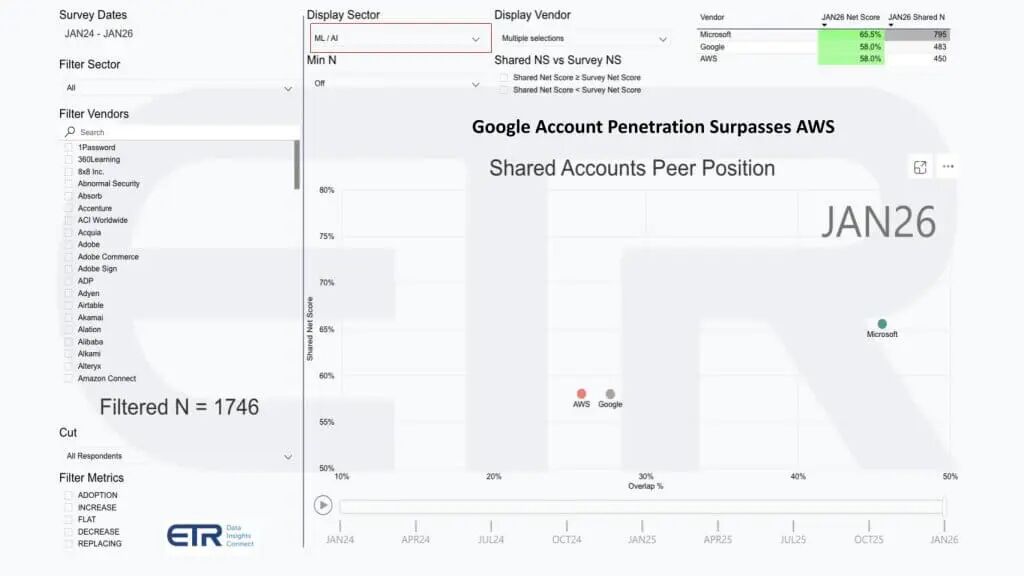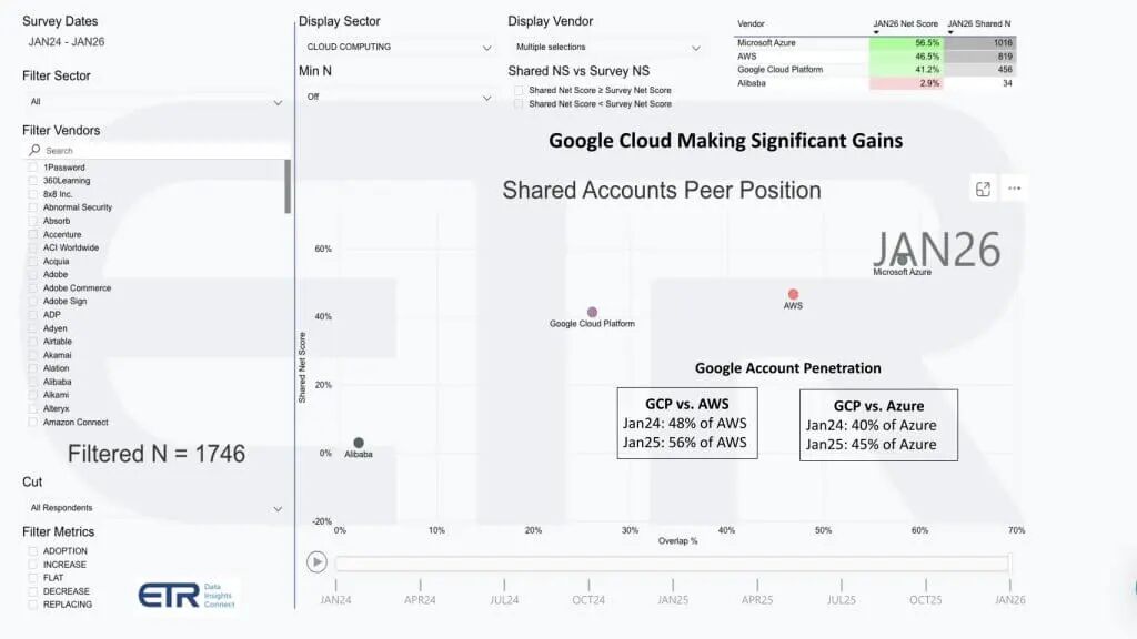 AWS也高度提升,Net Score约46.5,共享N约819。有趣变动是谷歌。GCP Net Score约41.2,共享N约456,使其高于高度提升阈值,但账户渗透仍落后前二。要问的是渗透差距是否缩小。答案是是的。
