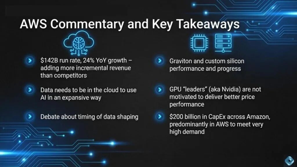 这将我们带回资本支出。AWS以迫使艰难选择的规模建设,芯片策略旨在控制单位经济并减少对单一供应商依赖。投资者真正询问的是资本支出多快转化为可持续货币化,以及自定义芯片策略是否随时间改善利润率。