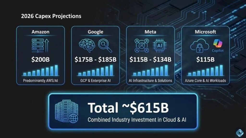 2026年伊始,科技巨头们便在资本市场投下了一枚重磅炸弹:Meta、微软、谷歌、亚马逊四家公司年度资本支出总额预计将飙升至惊人的6150亿美元,同比增长70%,其中大部分将涌入AI和云基础设施建设。