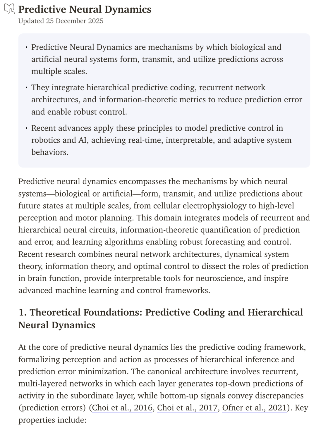 预测性神经动力学是生物和人工神经系统在多个尺度上形成、传输和利用预测的机制。 它们整合了分层预测编码、循环网络架构以及信息论度量,以减少预测误差并实现鲁棒控制。 最近的进展将这些原理应用于机器人学和人工智能中的预测控制建模,实现了实时、可解释和自适应的系统行为。 预测性神经动力学涵盖神经系统——无论是生物的还是人工的——在多个尺度上(从细胞电生理学到高层感知与运动规划)形成、传递并利用对未来状态之预测的机制。该领域整合了循环与层级神经回路模型、对预测与误差的信息论量化方法,以及支持鲁棒预测与控制的学习算法。近期研究结合了神经网络架构、动力系统理论、信息论与最优控制理论,以剖析预测在脑功能中的作用,为神经科学提供可解释的分析工具,并启发先进的机器学习与控制框架。