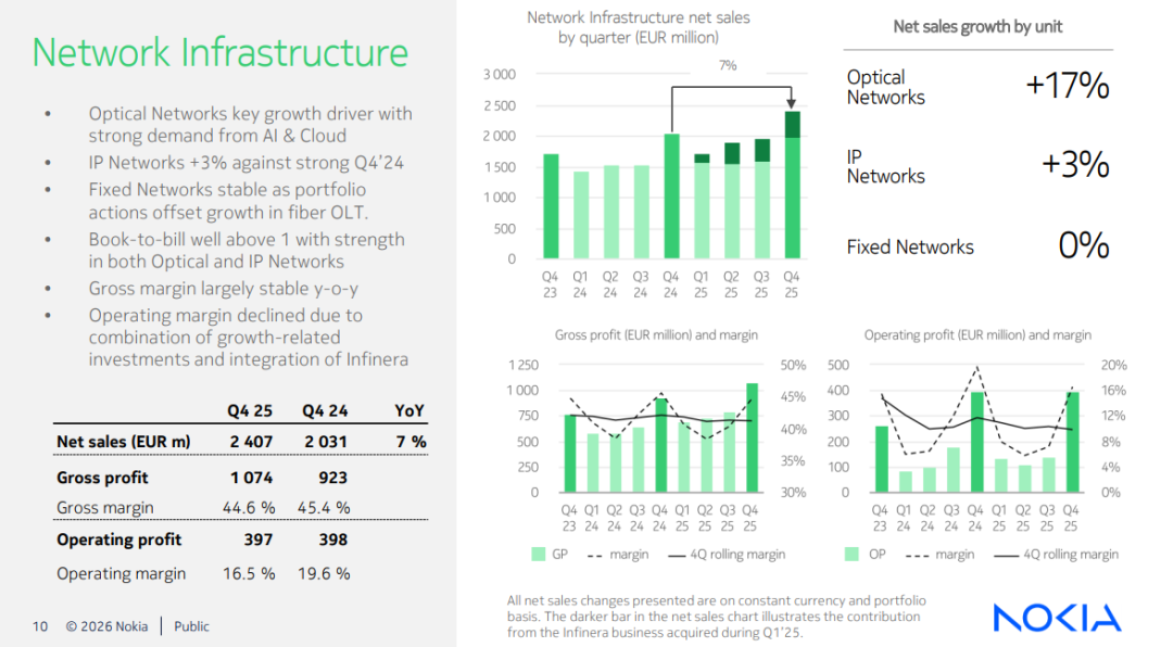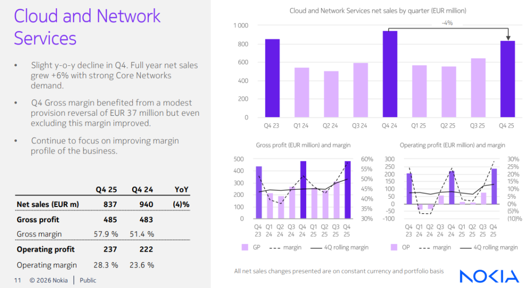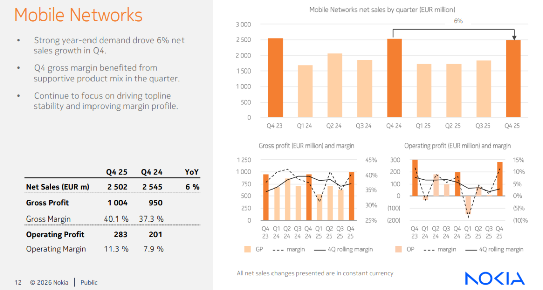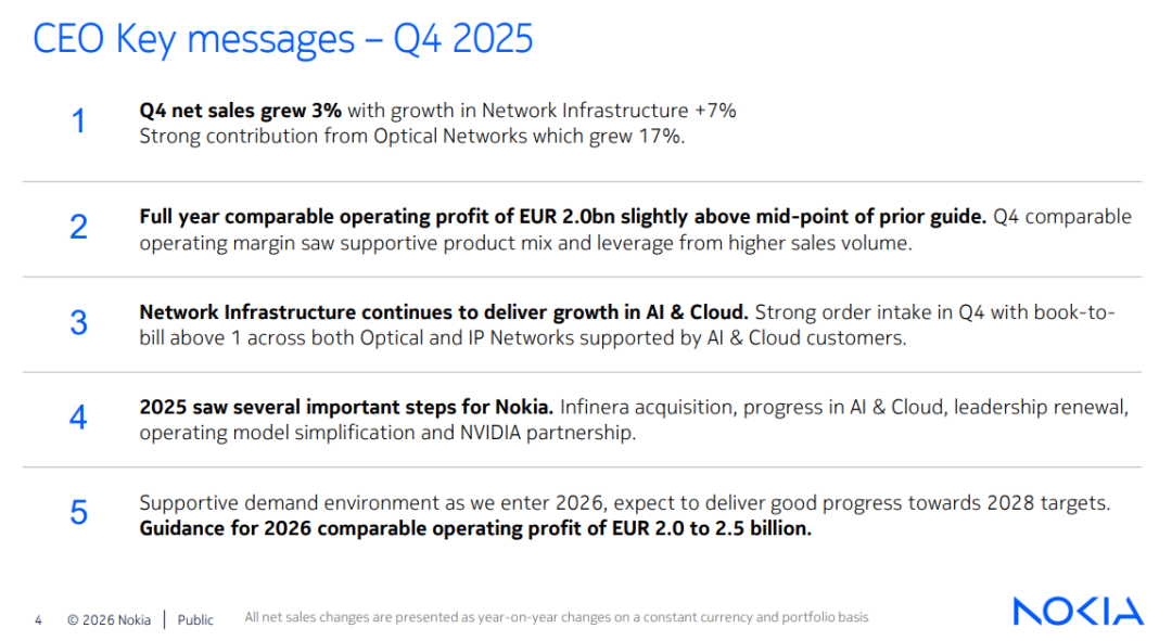 • 第四季度,可比净销售额按固定汇率和业务组合基础计算同比增长3%(按国际财报准则计算,同比增长2%),基础网络业务与移动网络业务均实现增长。 诺基亚,公众号:诺基亚-NOKIA诺基亚发布2025年第四季度及全年财报