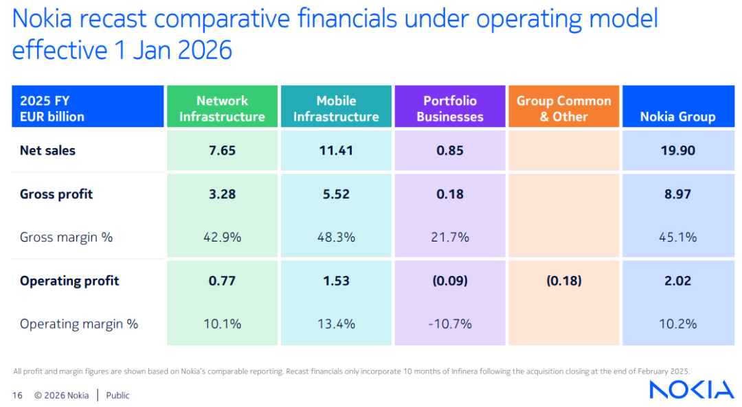 在财务层面,诺基亚2026年的目标是实现20亿至25亿欧元的可比营业利润。随着我们推出新产品,以及扩大在AI和云计算领域的布局,并持续进行面向长期增长的投资,网络基础设施业务呈现出强劲的需求趋势。在移动基础设施业务方面,我们预计市场环境整体趋于稳定,并将重点放在效率提升和盈利能力改善上。总体而言,我们预期,2026年诺基亚有望实现在去年11月资本市场日所提出的长期目标。 诺基亚,公众号:诺基亚-NOKIA诺基亚发布2025年第四季度及全年财报