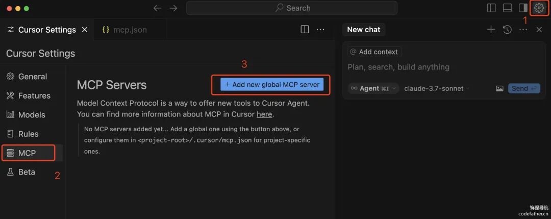 在右上角进入 Cursor Settings 设置界面,然后选择 MCP,添加全局的 MCP Server: