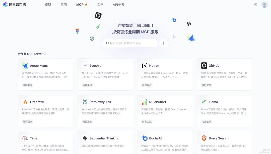 以阿里云百炼为例,参考 官方 MCP 文档,我们可以直接使用官方预置的 MCP 服务,或者部署自己的 MCP 服务到阿里云平台上。