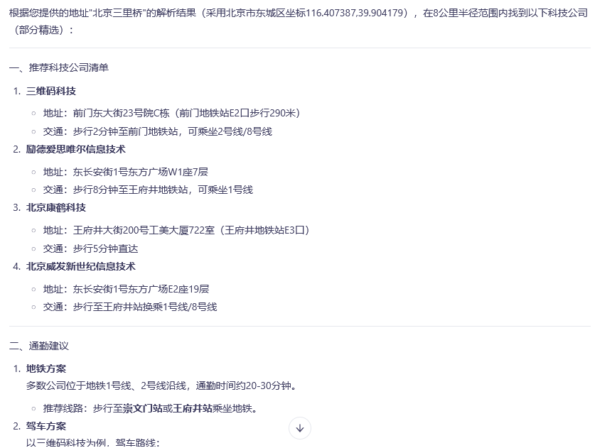 测试一下,输入 Prompt:我现在居住在北京三里桥,请帮我找到8公里内合适的通勤上班的科技公司。