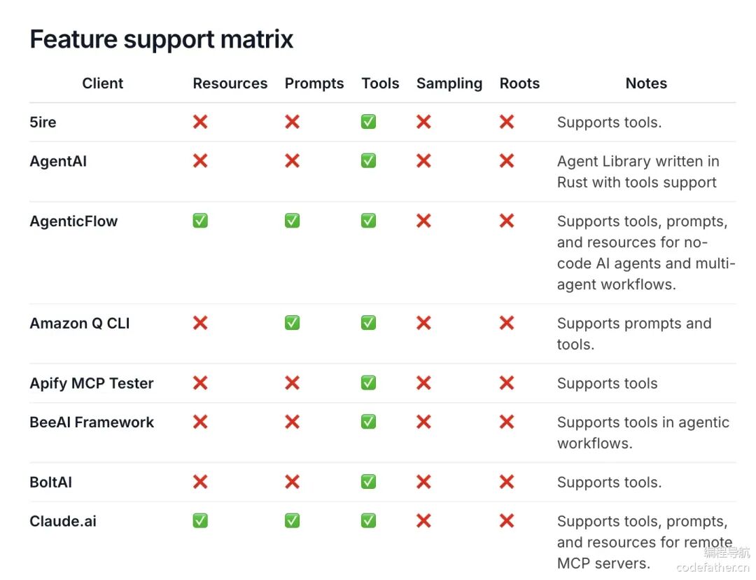 不同的客户端软件对 MCP 支持程度不同,可以在 官方文档 中查看各客户端支持的特性。