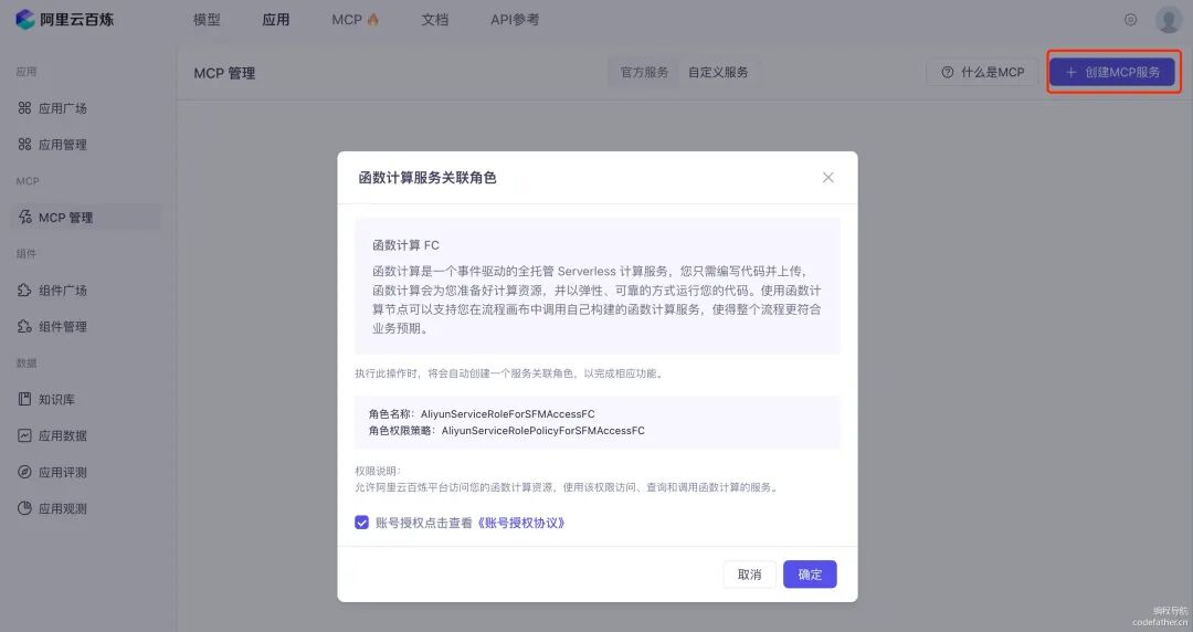 1)首先进入 MCP 管理页面,点击创建 MCP 服务: