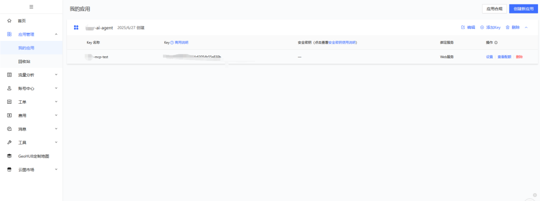 从配置中我们发现,使用地图 MCP 需要 API Key,我们可以到 地图开放平台 创建应用并添加 API Key: