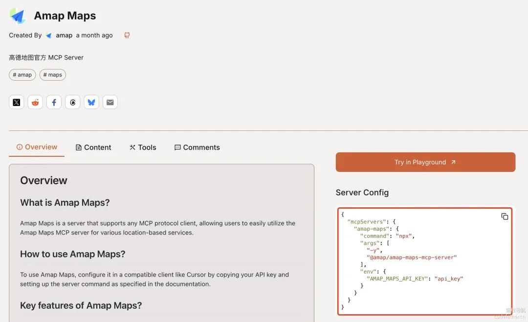 比如我们到 MCP 市场 找到 高德地图 MCP,发现 Server Config 中定义了使用 npx 命令行工具来安装和运行服务端代码: