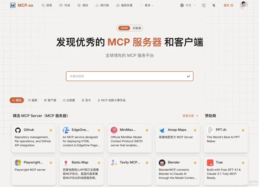 目前已经有很多 MCP 服务市场,开发者可以在这些平台上找到各种现成的 MCP 服务: