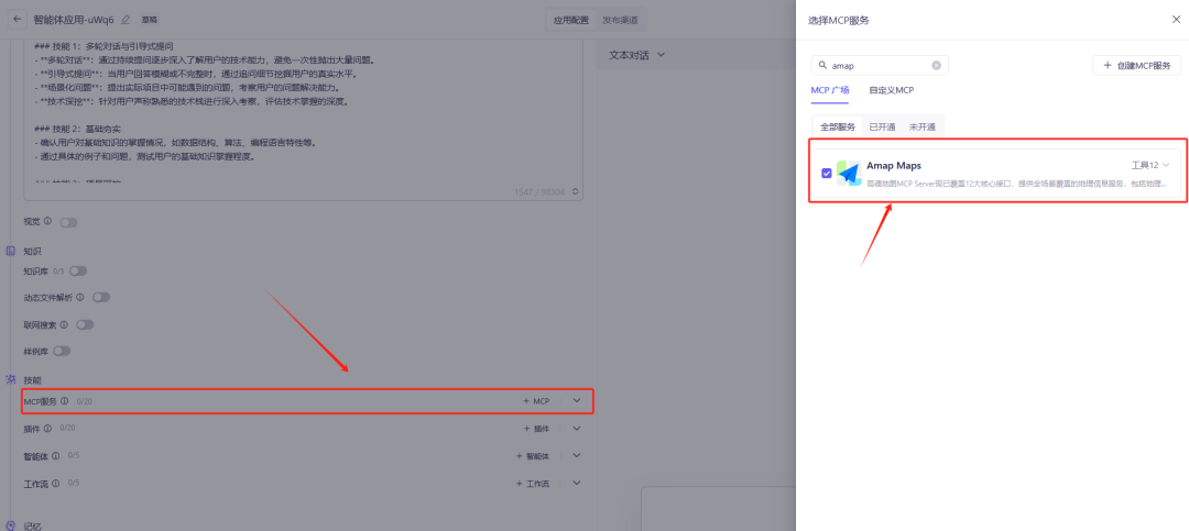 让我们进入一个智能体应用,在左侧可以点击添加 MCP 服务,然后选择想要使用的 MCP 服务即可,比如使用高德地图 MCP 服务,提供地理信息查询等 12 个工具。