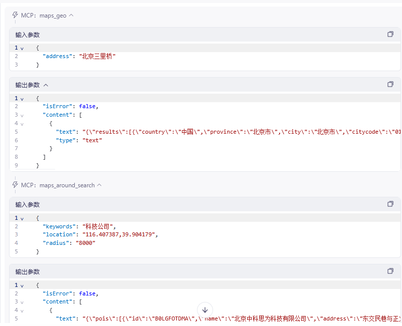 AI 会根据需要调用不同的工具,比如将地点转为坐标、查找某坐标附近的地点: