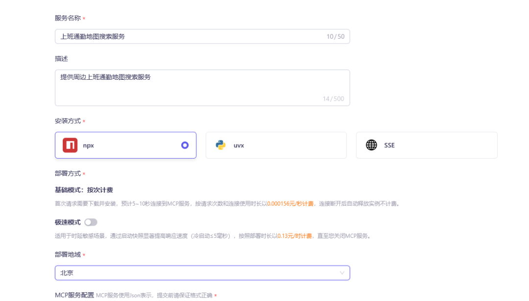 2)创建 MCP 服务,建议把描述写清楚。注意,安装方式必须选择 npx 或者 uvx 才可以触发函数部署,因为部署的原理就是在阿里云提供的计算资源上运行这些命令来启动服务进程。暂时不支持部署 Java 开发的 MCP,所以此处我们拿地图 MCP 演示: