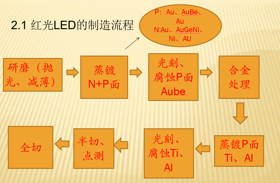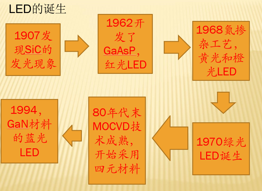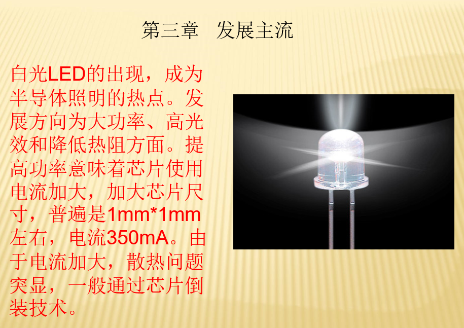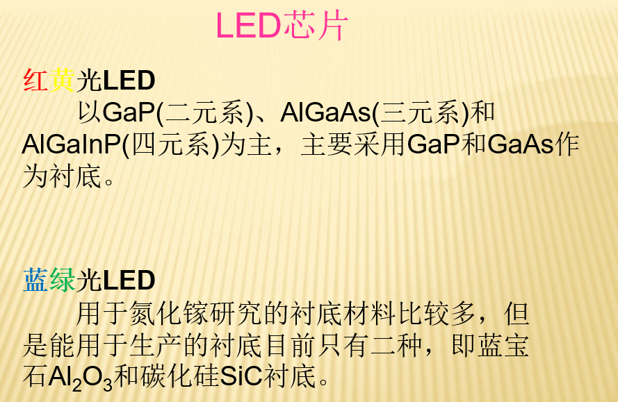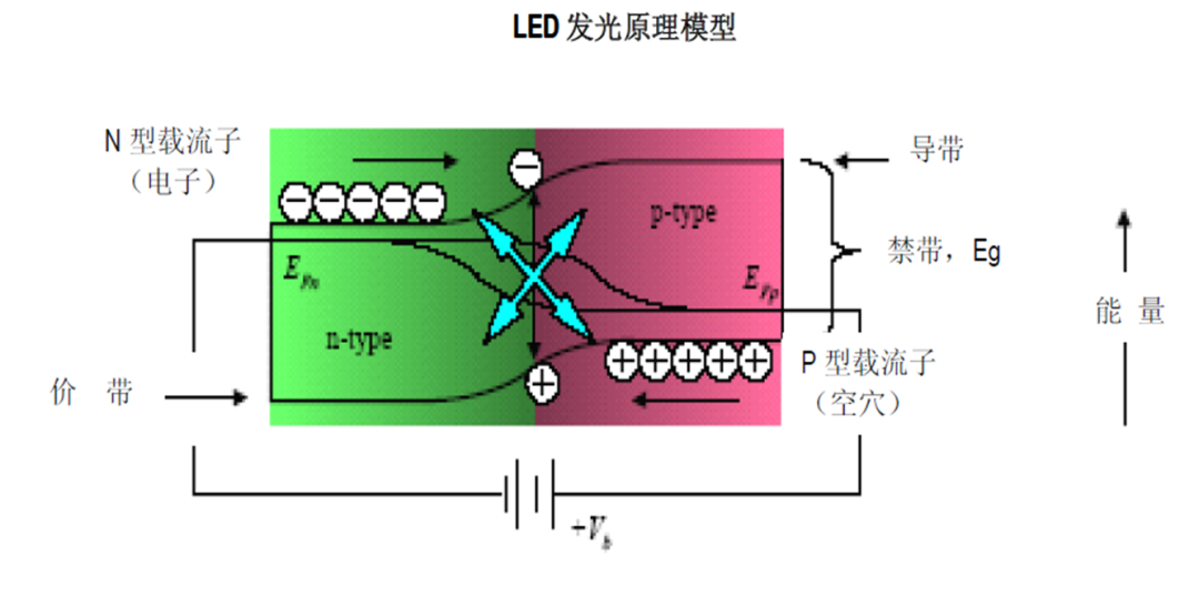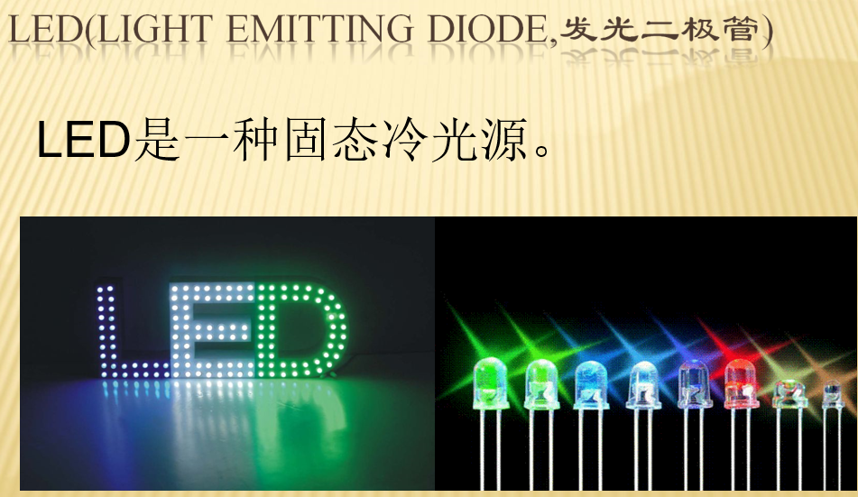 •LED(Light Emitting Diode)是种固态冷光源,其发光机理基于半导体PN结注入的电子与空穴的复合,又称为注入式电致发光。