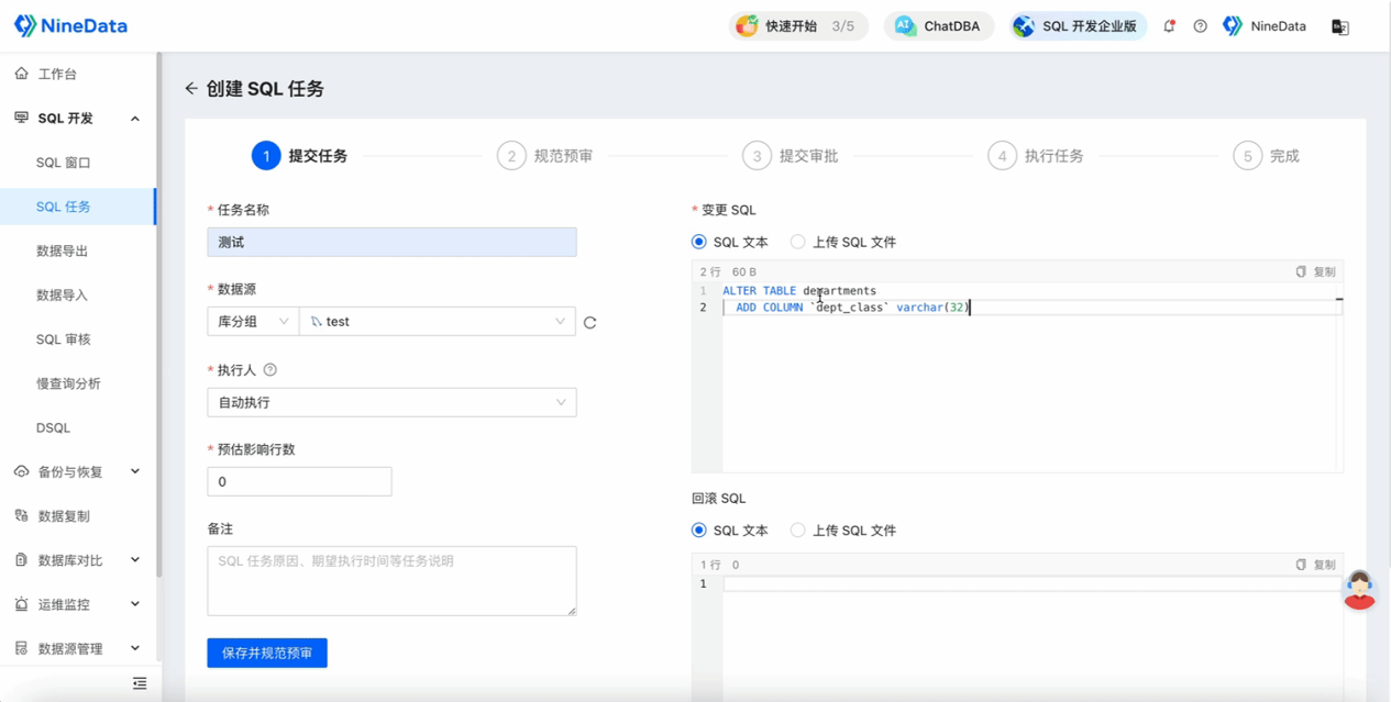 与前两者不同,NineData 是云原生一站式数据管理平台,核心定位是企业级数据全生命周期管控,数据变更审批是其核心能力之一。