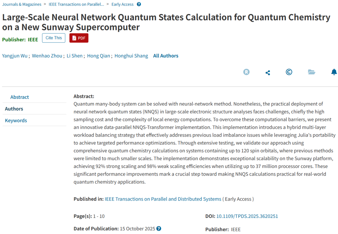 中国的科学家通过定制的NNQS-Transformer模型与基于申威(Sunway)SW26010-Pro CPU的神威·海洋之光超级计算机结合,实现了在包含多达 120 个自旋轨道的系统上的全面的量子化学计算。