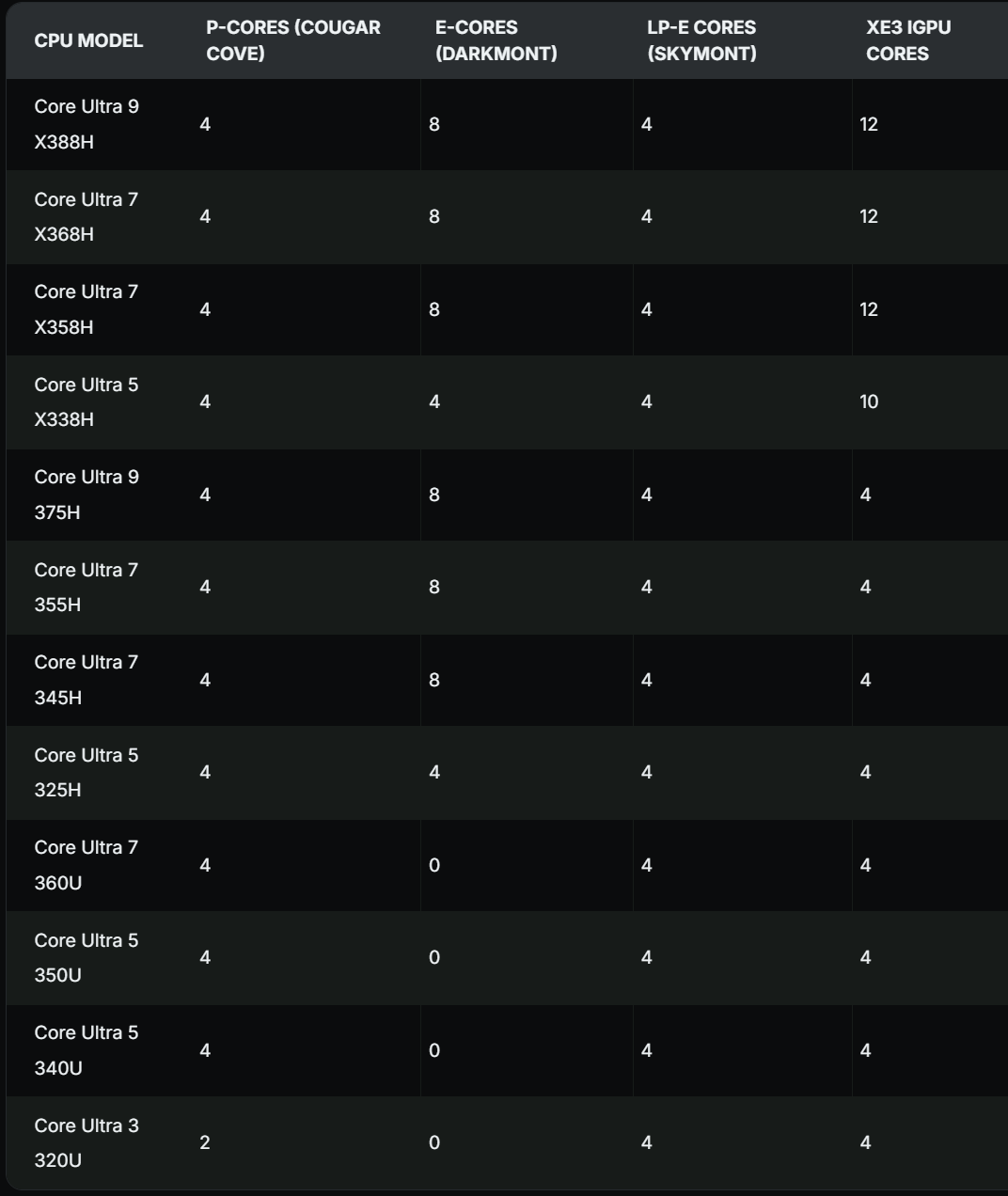 首批的4个常规的Core Ultra H系列分别为Core Ultra 9 375H、Core Ultra 7 355H、Core Ultra 7 345H和Core Ultra 5 325H。其中,前三款均配备了4个P核、8个E核、4个LPE核心,而Core Ultra 5 325H则只有4个E核心,这四款SKU均配备了4个Xe3 GPU内核。