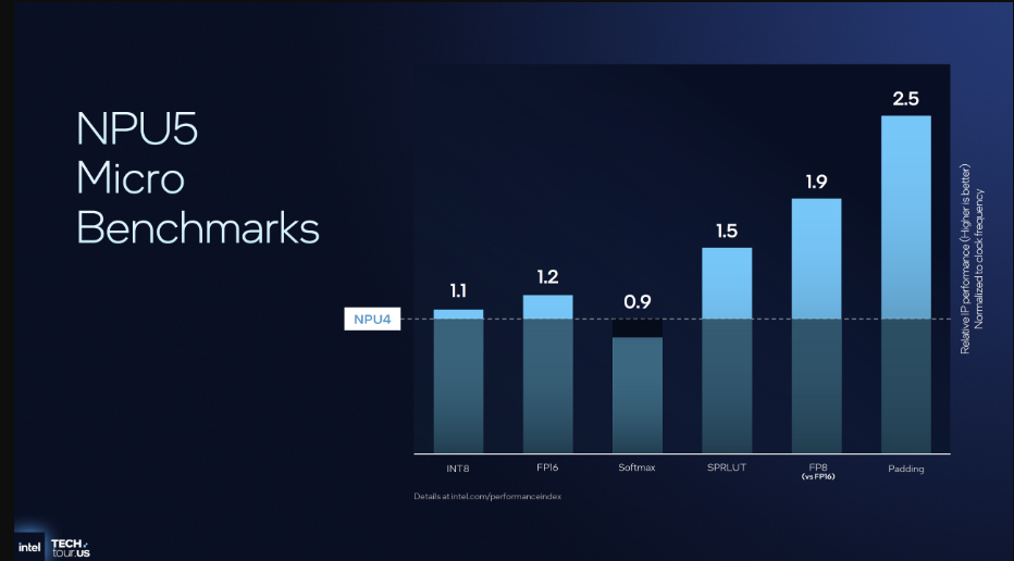 Panther Lake 推出了名为 NPU5 的更新一代的 NPU内核,相比Lunar Lake当中的NPU4,面积和效率都进行了优化。