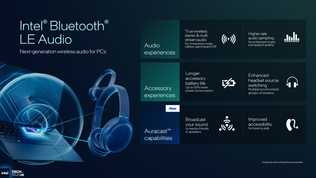 此外, Panther Lake在支持蓝牙6的同时,还带来了蓝牙 LE 音频解决方案,它提供真正的无线立体声和多流音频支持,以及更长的配件电池寿命(功耗降低多达 50%)、广播源的能力、更高速率的音频采样(增强的音乐和语音质量)、增强的耳机源切换和改进的可访问性。双蓝牙的配置,也使得整体的连接性能大幅提升。