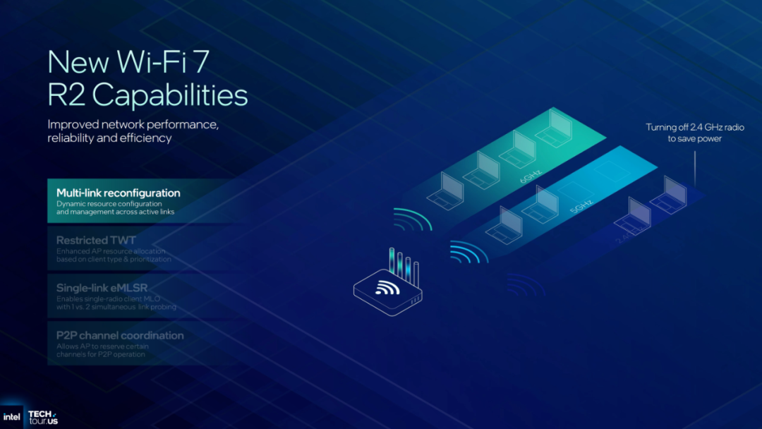 英特尔为 Panther Lake 平台添加两项主要无线连接升级。首先是 Wi-Fi7 R2,这是一个名为 Whale Peak 2 的集成 Wi-Fi 解决方案,它是一种带有专用 PMIC 的封装解决方案。