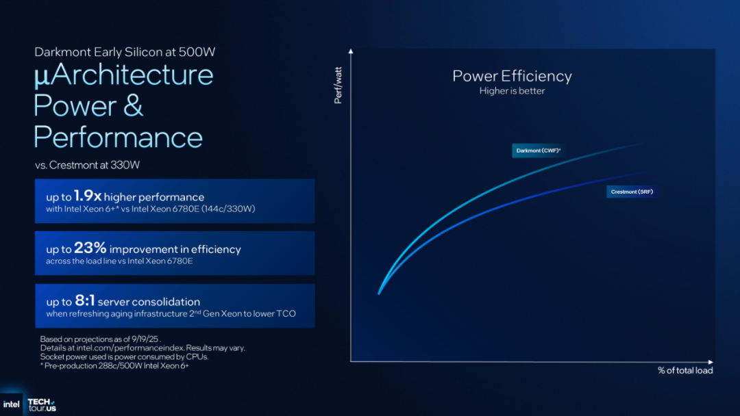 英特尔至强6+性能和效率图,比较了Darkmont和Crestmont在500W和330W下的性能和效率,突出了电源效率。