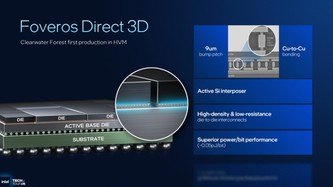 Clearwater Forest 也是第一个利用 Foveros Direct 3D 技术的大批量生产 CPU,这是一种先进的封装解决方案,可在基本活动图块上将Compute Tile 和 IO Tile桥接在一起。Foveros Direct 3D 具有 9um 凸块间距,并使用铜对铜键合。它充当具有高密度和低电阻的有源硅内插器,并提供 ~0.05pJ/bit 性能。这意味着英特尔需要花费几乎零的功耗来在两个芯片之间移动数据。