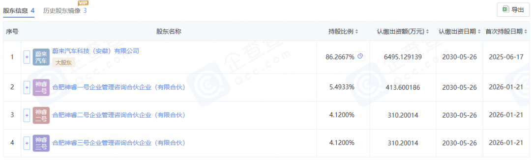 在本轮融资前,蔚来汽车科技(安徽)有限公司持有安徽神玑86.27%的股份,其余股份由白剑与安徽神玑董事张丹瑜持股90%的三家有限合伙企业持有。