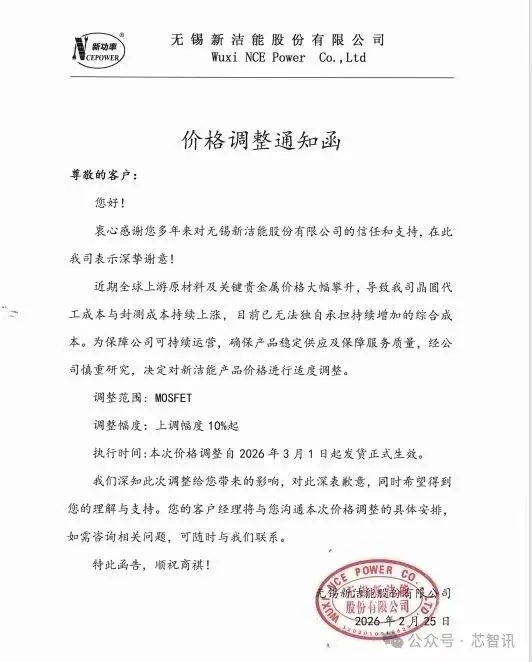 继续国产功率半导体厂商士兰微、宏微科技相继宣布涨价之后,又一家国产功率半导体厂商宣布涨价。 2026年2月25日,国产功率半导体厂商——无锡新洁能股份有限公司(以下简称“新洁能”)向客户发出“价格调整通知函”,宣布将对MOSFET涨价,涨价幅度为10%起,2026年3月1日起发货正式生效。