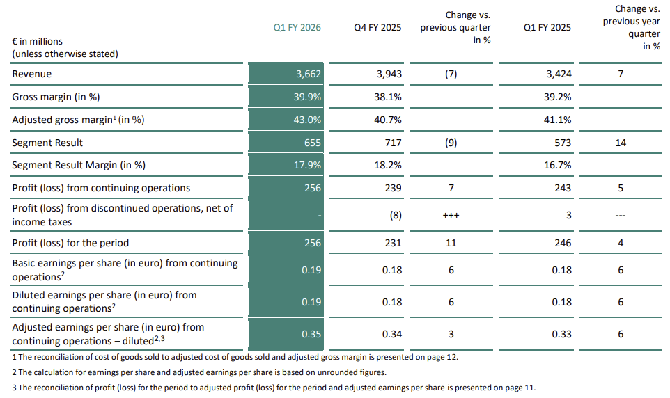 2月4日,英飞凌公布了2026财年第一季度财报(数据均截至2025年12月31日),营收为36.62亿欧元,同比增长7%,环比下滑 7%,略高于分析师们平均预估的约36.2亿欧元;营业利润约2.56亿欧元,同比增长约5%,略高于分析师平均预期;经调整后的利润率为17.9%,高于分析师平均预期的16.8%;调整后的第一财季每股收益约0.35欧元,高于上年同期的0.33欧元,同时也高于分析师平均预期。