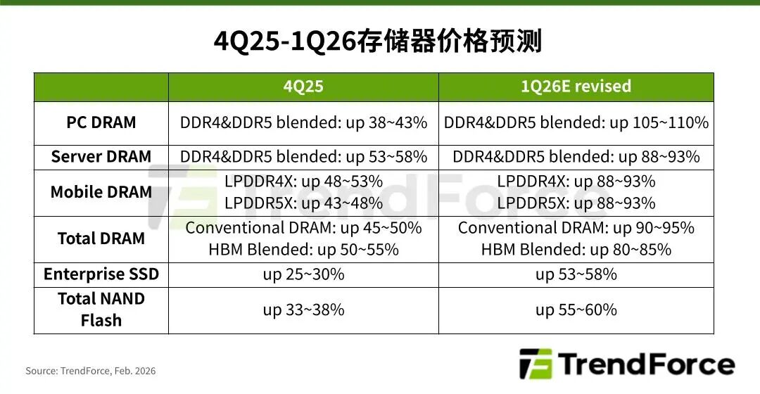 2月2日,市场研究机构TrendForce最新公布的存储产业调查报告显示,2026年第一季人工智能(AI)与数据中心需求持续加剧全球存储芯片供需失衡,原厂议价能力有增无减,TrendForce全面上修第一季DRAM、NAND Flash各产品价格季成长幅度,预估整体conventional DRAM(通用/传统DRAM)合约价从1月初季增55%~60%,改为上涨90%~95%,NAND Flash合约价从季增33%~38%上调至55%~60%,且不排除再上修可能。