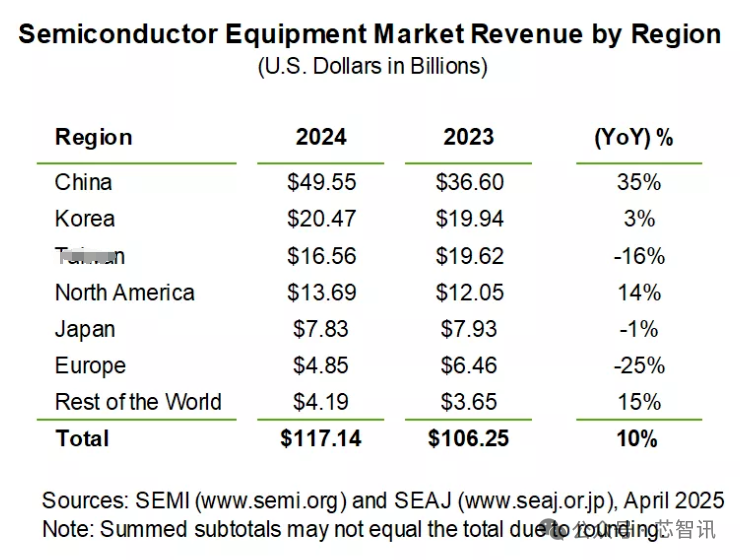 4月10日消息,根据SEMI(国际半导体行业协会)最新公布数据显示,2024年全球半导体设备销售额同比增长10%至1171.4亿美元,这已经是五年来第四度呈现增长,年销售额超越2022年的1076.4亿美元,创下历史新高纪录。其中,中国大陆市场销售额同比大涨35%,连第五年成为全球最大半导体设备市场。