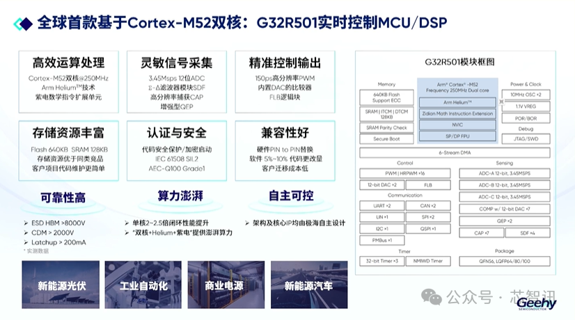 面对机器人控制系统的新需求,极海半导体也发布了首款基于Arm Cortex-M52双核的实时控制MCU G32R501。卢鹏升表示,“首先机器人需要一个高性能的大脑,所以这个芯片具备2个大脑+2个小脑;第二,机器人要做高精度的感知,对应MCU要做高精度的感知,不仅配置高精度的ADC,还配置用了高精度的DAC;同时还要有针对控制的部分,针对输出的部分,以及针对安全的部分。”
