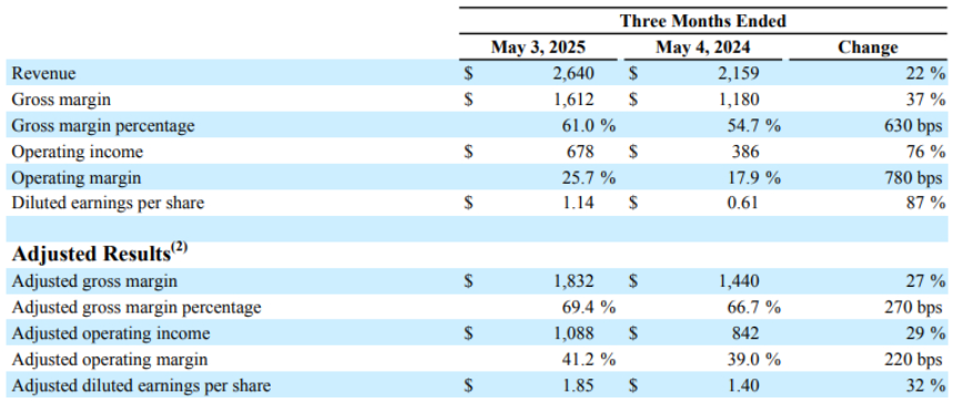 5月23日消息,模拟芯片大厂ADI(Analog Devices Inc.)于当地时间 22日公布了2025会计年度第二季(截至2025年5月3日)财报,受益于AI带动的模拟芯片需求,ADI第二季营收26.4亿美元,同期大涨22%,超越FactSet调查的分析师平均预期的25.1亿美元;调整后每股收益1.85美元,也优于FactSet调查的分析师平均预期的1.70美元。