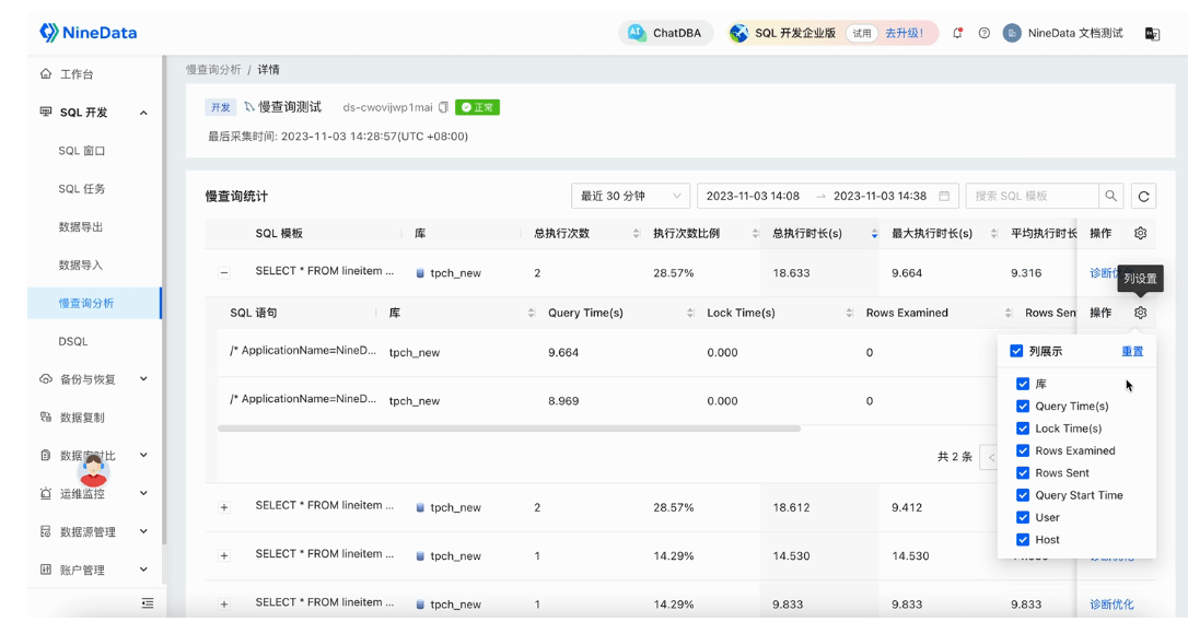 NineData 慢查询分析支持按时间范围看趋势