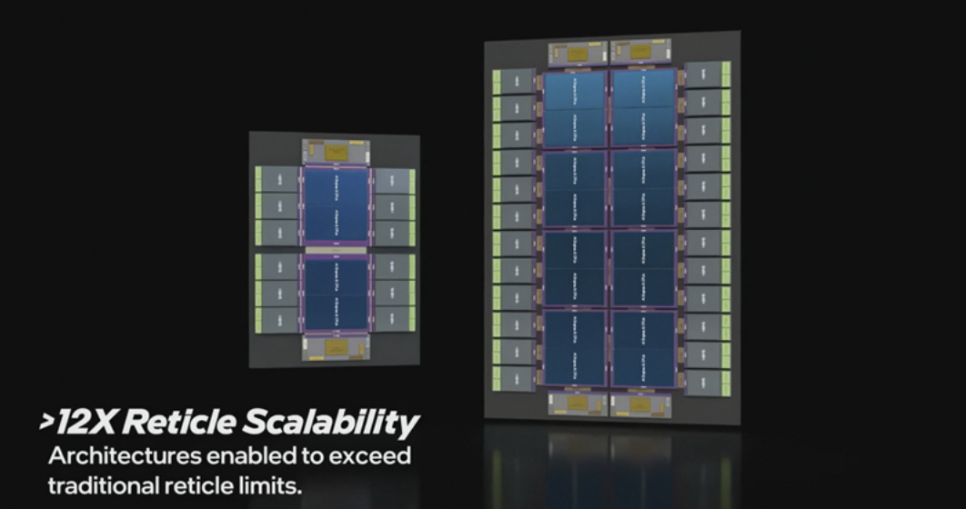 另外,英特尔还在展示视频中披露了两款极具前瞻性的概念设计,展现了其超越传统光罩限制(Reticle Limit)的技术实力。其中在中阶解决方案方面,可配备4个计算芯片与12个HBM。至于在旗舰解决方案方面,则是将规模扩大到16个计算芯片与24个HBM ,并可配置多达48个LPDDR5X 控制器,极大化AI 与数据中心工作执行所需的内存密度。