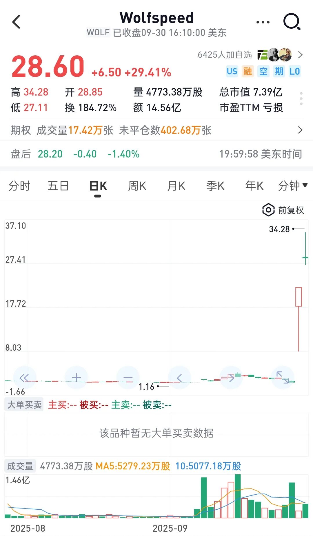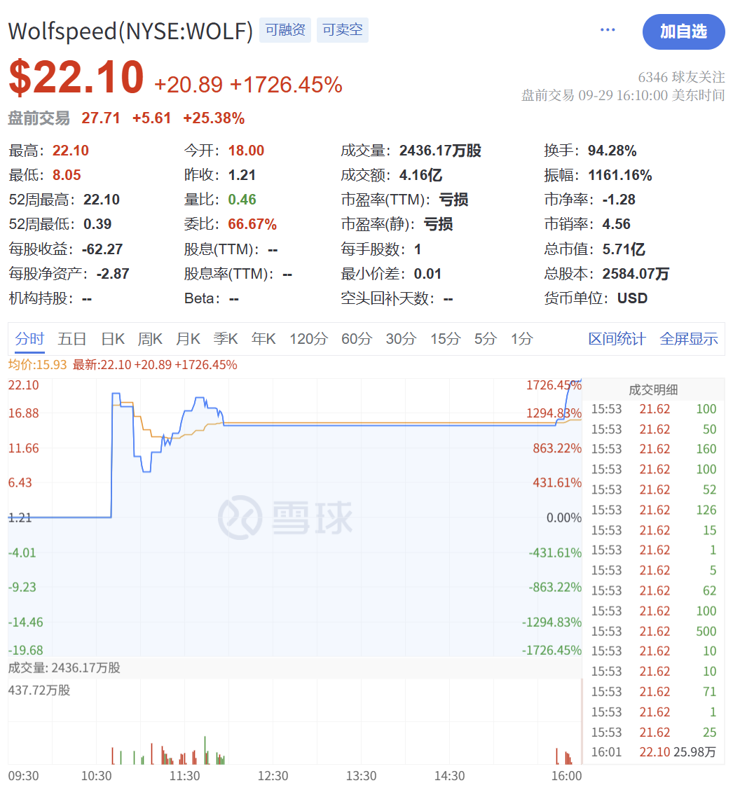 9月30日的盘中交易,Wolfspeed的股价一度继续暴涨超52%,收盘涨幅回落至29.41%,收于28.6美元/股。