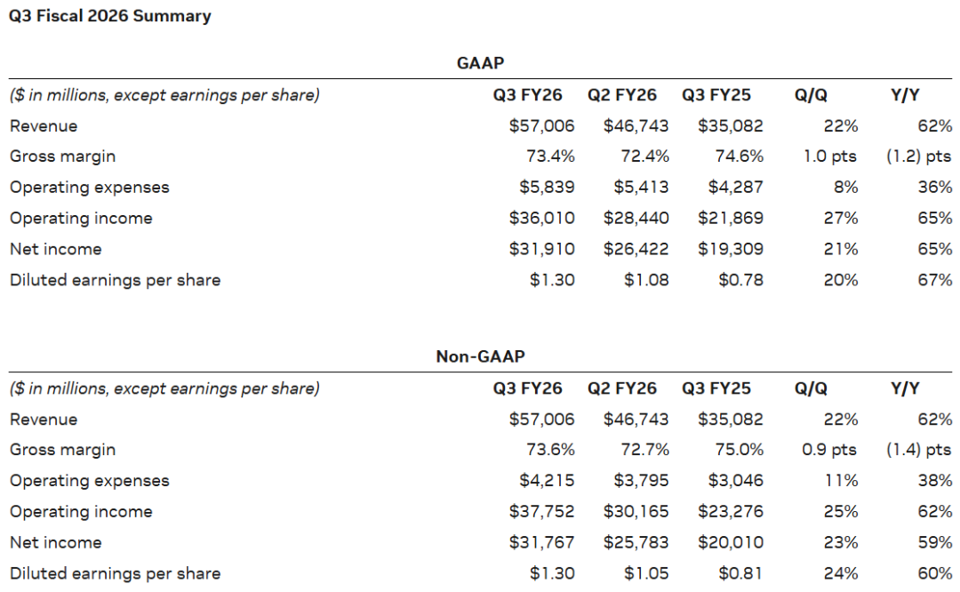 非GAAP准则下,毛利率为73.6%;净利润为317.7亿美元,同比大涨59%,环比增长23%;摊薄后每股收益1.3美元,同比增长60%,环比增长24%。显示出英伟达强大的盈利能力和运营效率。