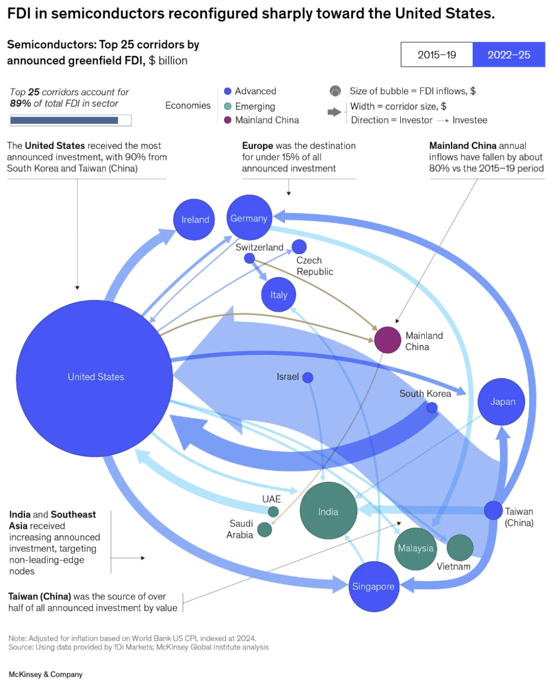 11月27日消息,据麦肯锡最新发布的一份研究报告显示,在美国特朗普政府上台之后,2025年半导体业的外国直接投资(FDI)有近90%流向了美国,且多由中国台湾、韩国企业推动。