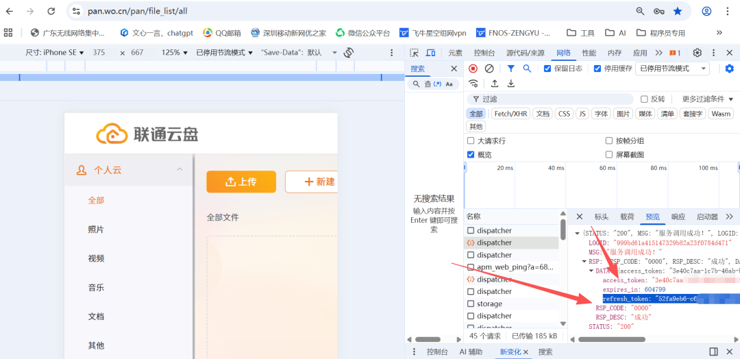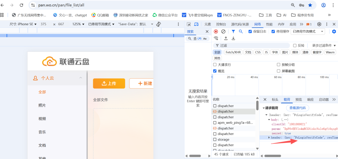 打开联通云盘的官方地址,点击登录,打开开发者模式,网络,找到下面这个key=PcLoginVerifyCode中的预览响应信息。