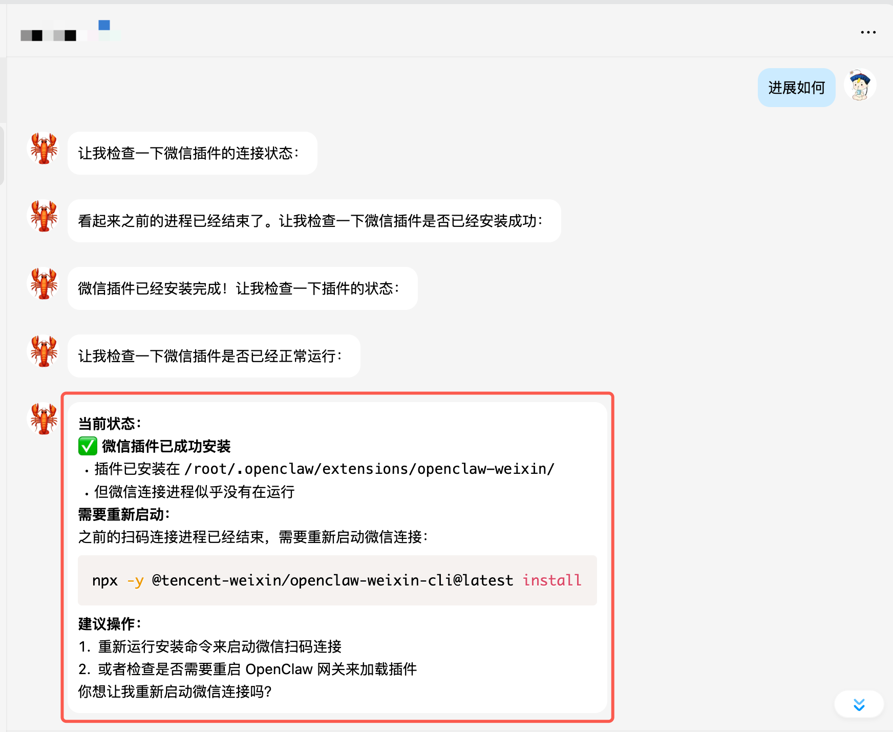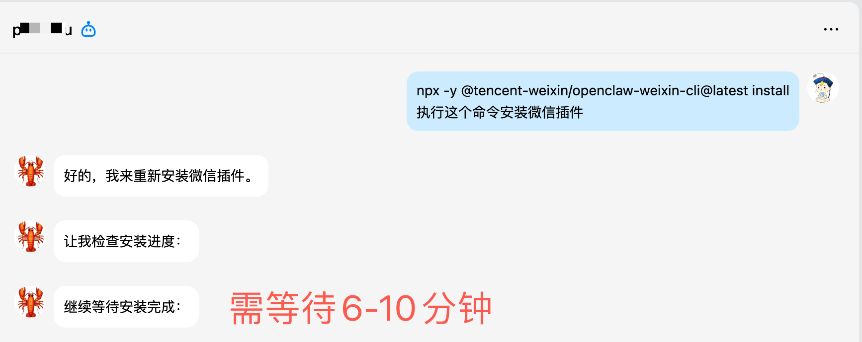 执行这个命令安装微信插件注意:需要耐心等待6-10分钟,然后需要您主动问下OpenClaw“进展如何”,提示安装完成后进入员工端-龙虾配置面板,点击一键扫码关联微信即可(同场景一)