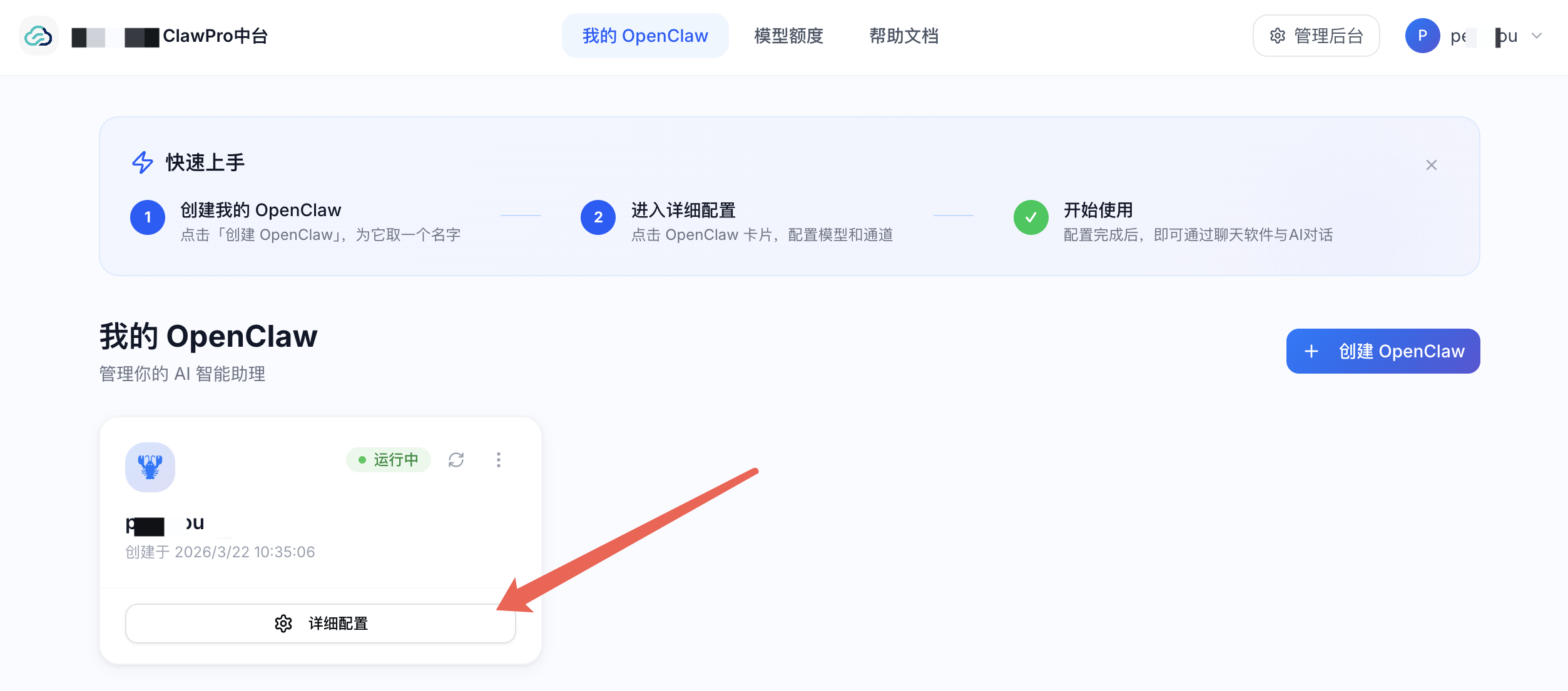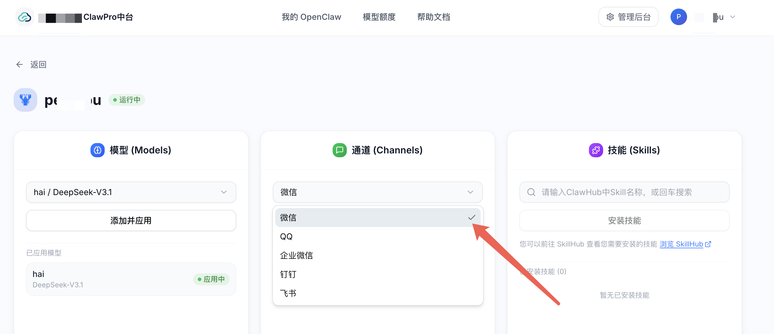 进入ClawPro用户端,点击详细配置,配置“微信”,注意不是企业微信